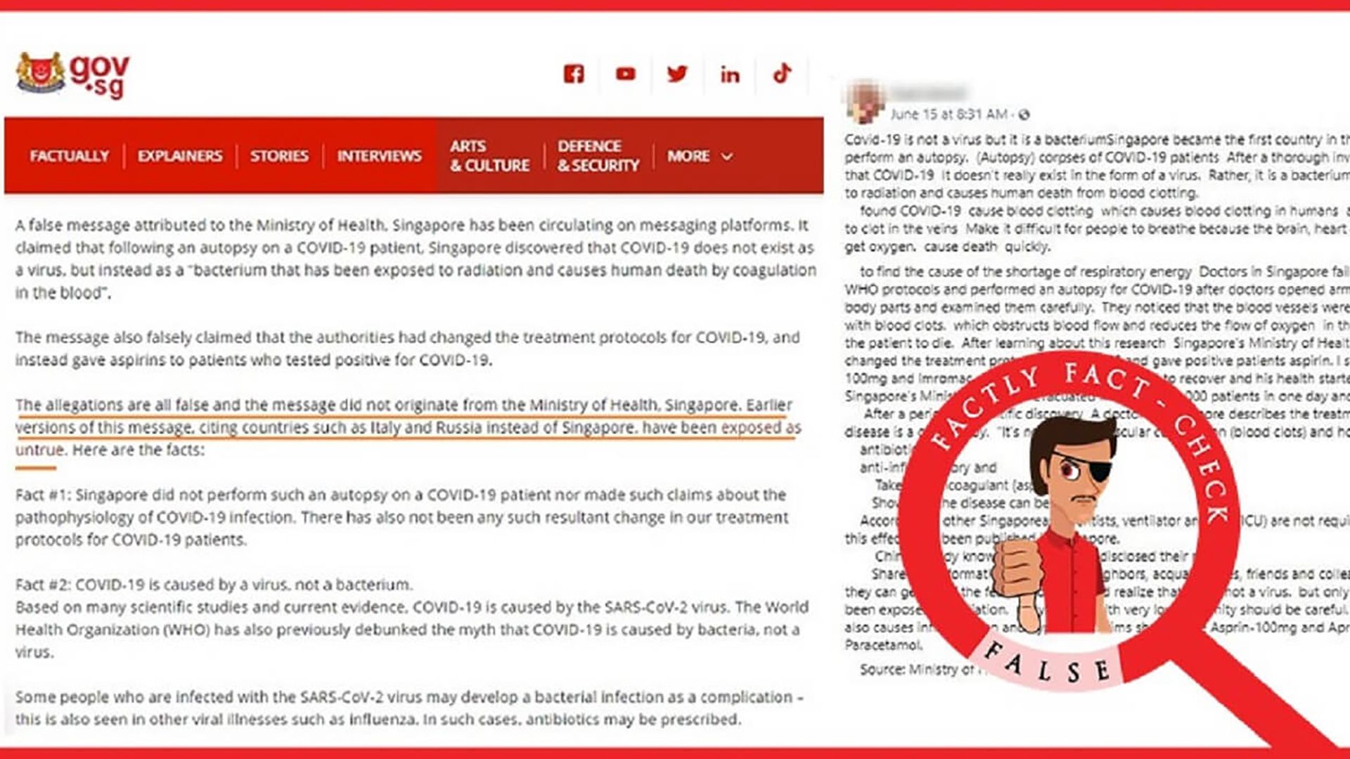 Невистинит е овој пост во којшто се тврди дека Сингапур открил оти ковид-19 е предизвикан од бактерија, а не од вирус, како и тоа дека ја променил терапијата за лекување. Исто така, не е точно дека обдукцијата била извршена спротивно на протоколите и насоките од СЗО, затоа што СЗО не ги забранува обдукциите на починатите од ковид. Ковид-19 е предизвикан од вирус, а не од бактерија и ова е третото лажно тврдење во постот. Фактот што овие дезинформации им се атрибуираат на официјални медицински власти на Сингапур, покажува колку пропагандата и машината за лажни информации...