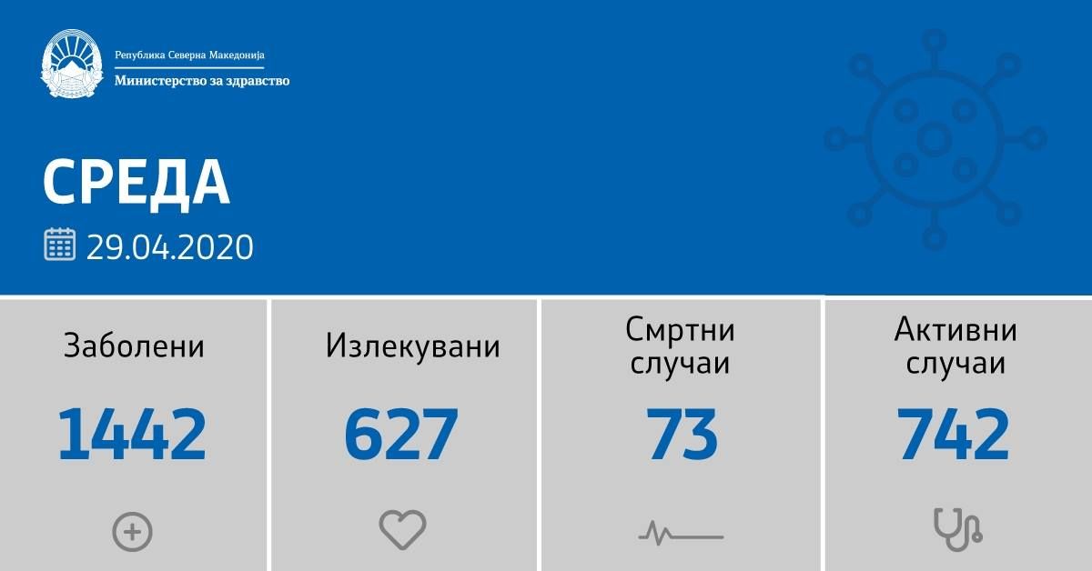 Во изминатите 24 часа направени се 279 тестирања, а потврден е 21 нов случај на коронавирус и тоа во: Скопје – 7, Куманово -6, Прилеп-4, Тетово-1, Пехчево-1, Делчево -1, Струга-1. Со ова, вкупната бројка на КОВИД-19 дијагностицирани во нашата земја изнесува 1442, бројката на оздравени пациенти е 627, на починати е 73, а во моментов бројот на активни случаи во земјата изнесува 742.