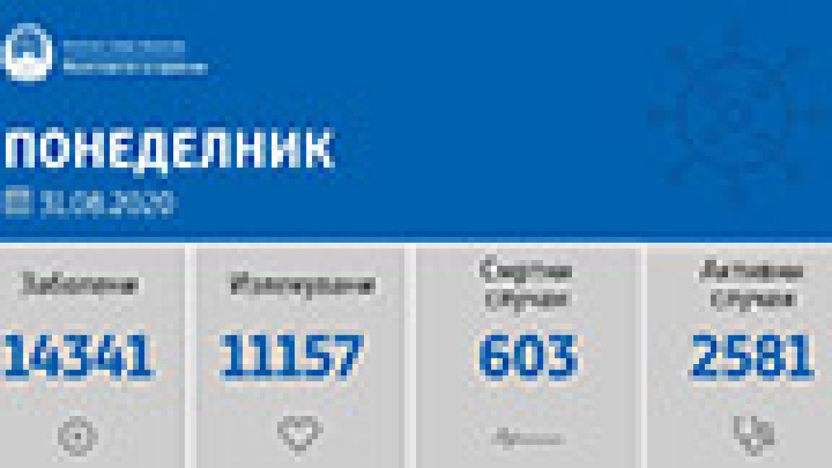 Вкупната бројка на ковид дијагностицирани во нашата земја од почетокот на епидемијата изнесува 14341, бројката на оздравени пациенти е 11157, на починати е 603, а во моментов бројот на активни случаи во земјата изнесува 2581.