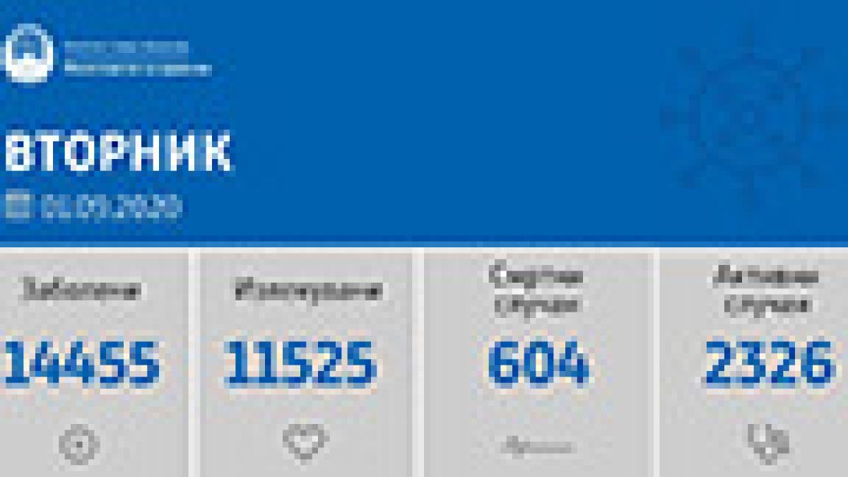 Вкупната бројка на ковид дијагностицирани во нашата земја од почетокот на епидемијата изнесува 14455, бројката на оздравени пациенти е 11525, на починати е 604, а во моментов бројот на активни случаи во земјата изнесува 2326.