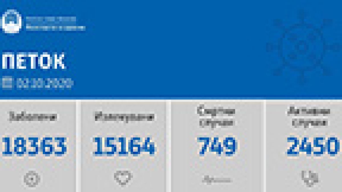 Досега во земјата се направени вкупно 191.821 тестирања на Ковид -19. Нема тестирања во рамките на скринингот.Вкупната бројка на ковид дијагностицирани во нашата земја од почетокот на епидемијата изнесува 18363, бројката на оздравени пациенти е 15164, на починати е 749, а во моментов бројот на активни случаи во земјата изнесува 2450.