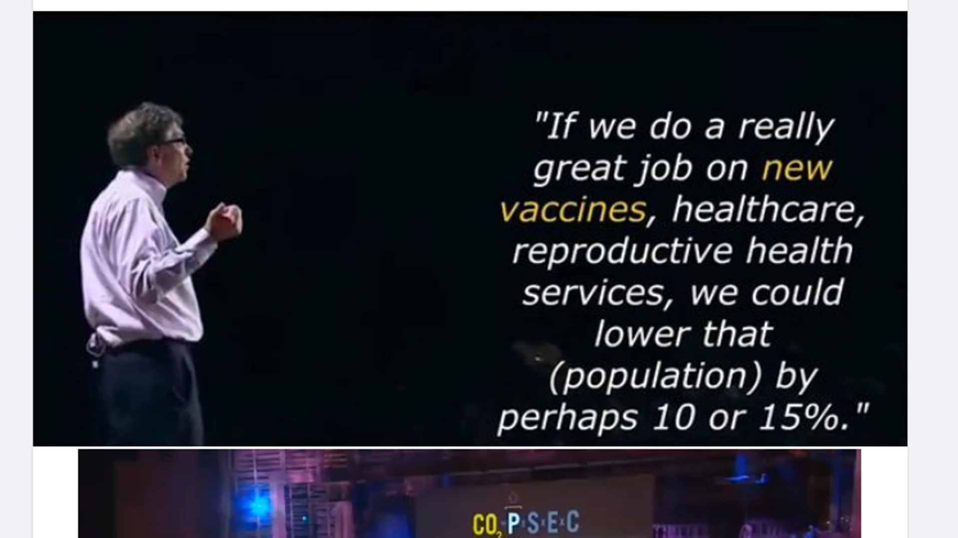 Во постот наменски е прикажано манипулативно видео извадено од контекст. Темата на којашто говори Бил Гејтс во 2010 година во „Тед Разговорите“ воопшто не е поврзана ниту со ковид, ниту со депопулација на населението преку вакцинација. Говорот на Гејтс е фокусиран на потребата да се елиминира емисијата на јаглерод диоксид со нови пристапи на енергетска продукција за да се избориме со климатските промени. Впрочем и самото видео коешто е претставено во постот датира десет години пред појавата на пандемијата на коронавирусот и вакцините.