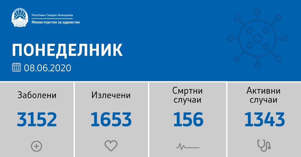На Клиниката за инфективни болести и фебрилни состојби почина пациент од Куманово на 70 години, хоспитализиран на 4 јуни и двајца од Скопје, пациент на возраст од 62 години, хоспитализиран од 5 јуни и пациент на возраст од 78 години, хоспитализиран на 2 јуни.