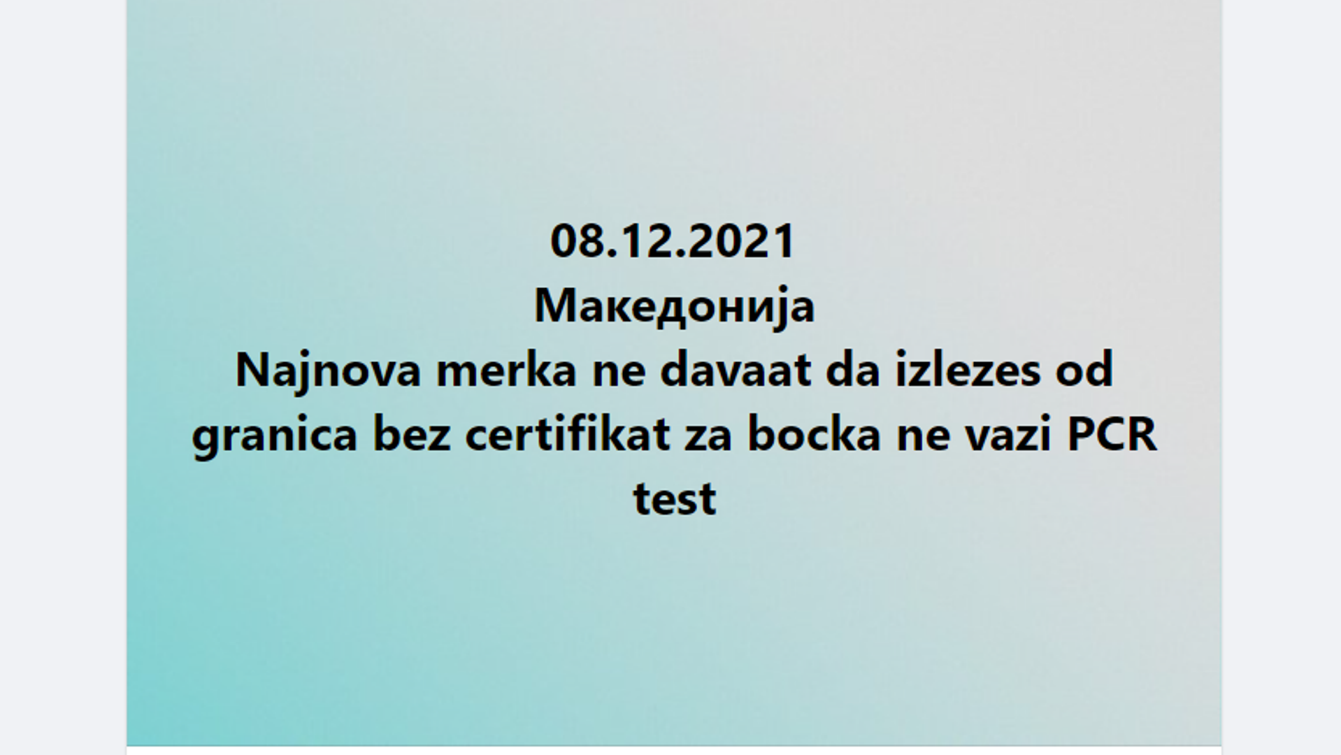 Според информациите објавени на сајтот на МНР, односно протоколите за С. Македонија, Владата на седница, одржана на 31 август 2021 година донесе одлука, според која еден од документите што овозможуваат влез или излез од земјава е и „негативен резултат од брз тест за антиген, направен 48 часа пред влез или излез од територијата на Република Северна Македонија“. Оваа одлука на Владата е се уште во сила, што значи не е точно тврдењето во рецензираниот пост дека ПЦР тестот „не важи“. Сосема друга работа е какви одредби има во државите во кои ќе патувате.