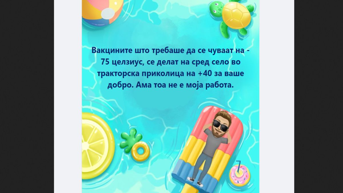 Вакцините што требаше да се чуваат на -75 целзиус, се делат на сред село во тракторска приколица на плус 40 за ваше добро. Ама тоа не е моја работа.