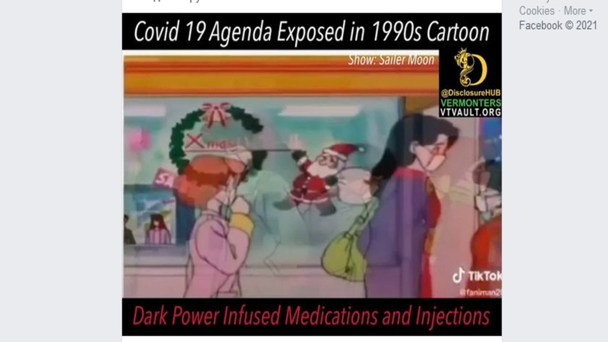 Станува збор за јапонскиот цртан филм Sailor Moon, оригинално од 1992 година. Во видеоматеријалот се тврди дека ковид-19 е разобличен во цртан филм од 1990-тите години, односно дека цртаниот филм се однесува на ковид-пандемијата, само затоа што во сценариото на цртаниот филм се изложени елементи од нарација (комплетно фиктивни), во кои се тврди дека темните сили сакаат да продолжат да даваат медикаменти и вакцини кај населението.