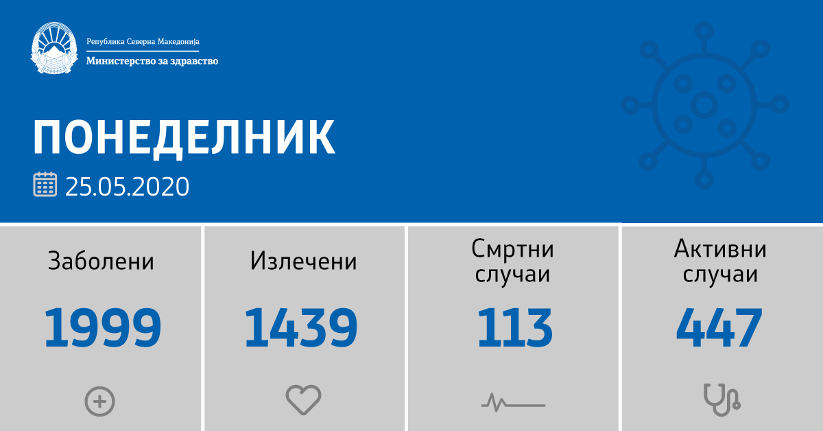 Вкупната бројка на ковид дијагностицирани во нашата земја од почетокот на епидемијата изнесува 1999, бројката на оздравени пациенти е 1439, на починати е 113, а во моментов бројот на активни случаи во земјата изнесува 447.